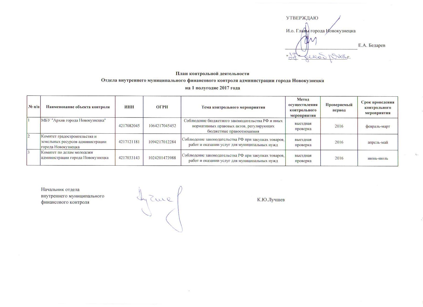 План контрольной деятельности на 1 полугодие 2017 года от 27.12.2016г.