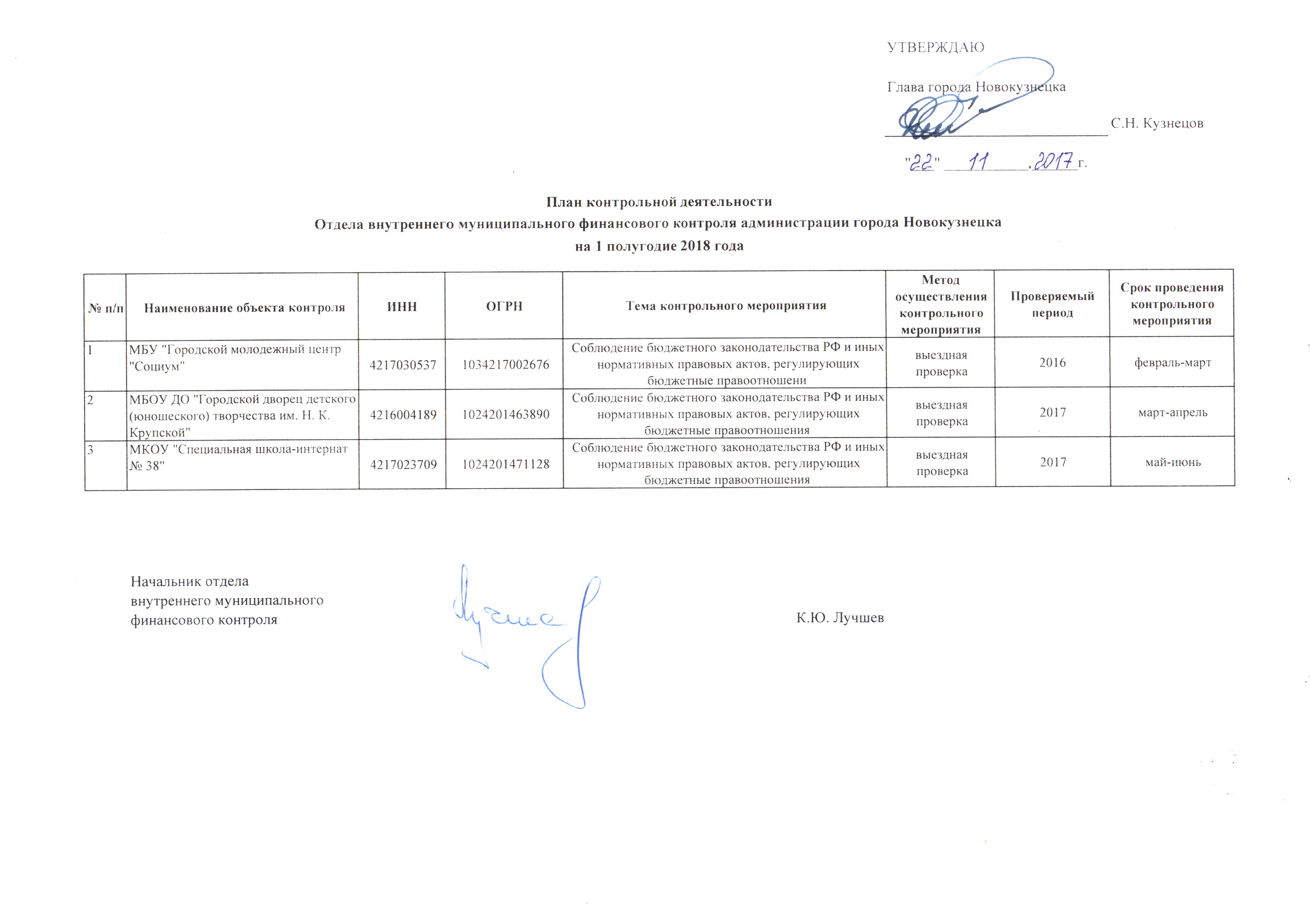 План контрольной деятельности на 1 полугодие 2018 года от 22.11.2017г.