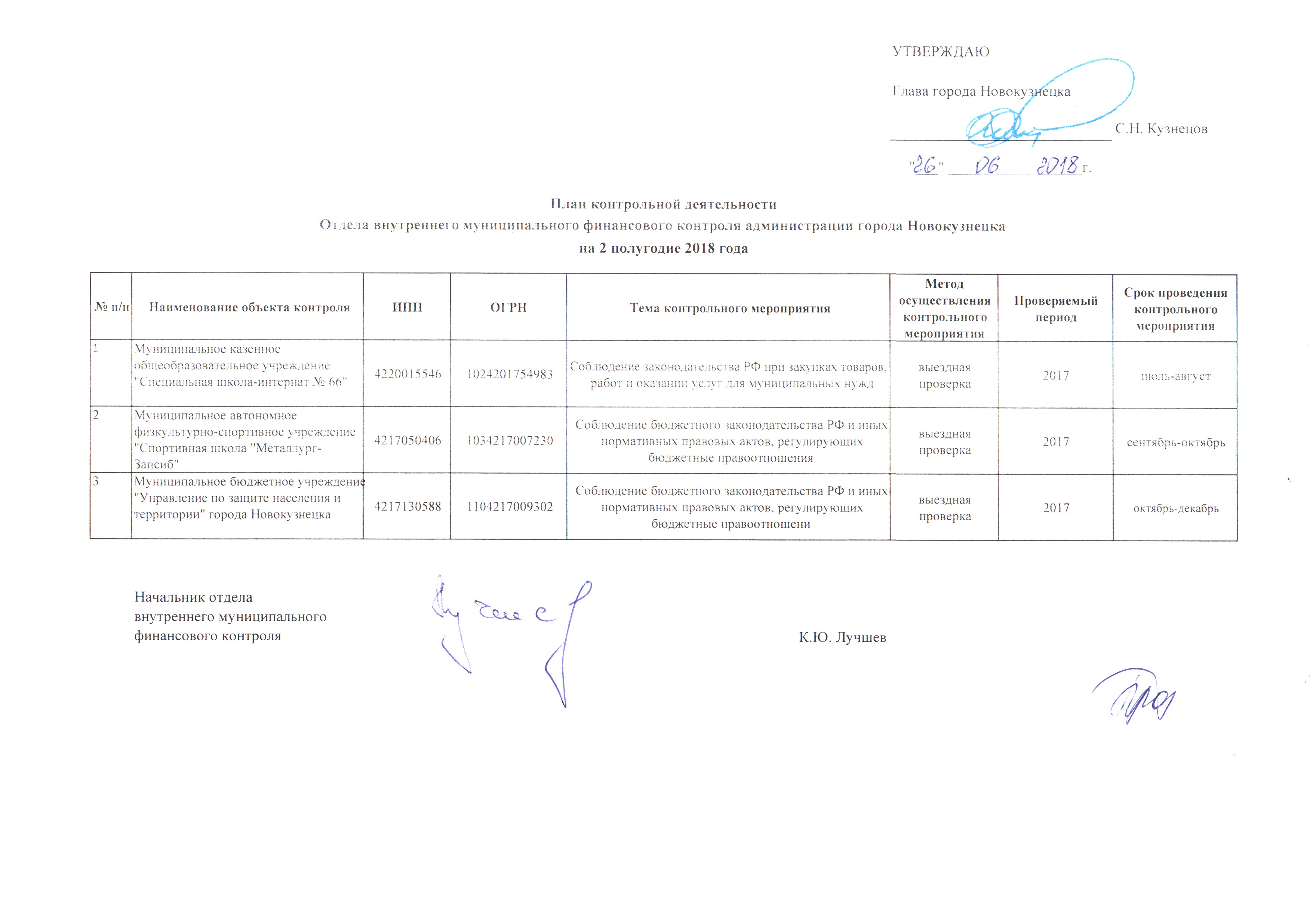 План контрольной деятельности на 2 полугодие 2018 года от 26.06.2018г.