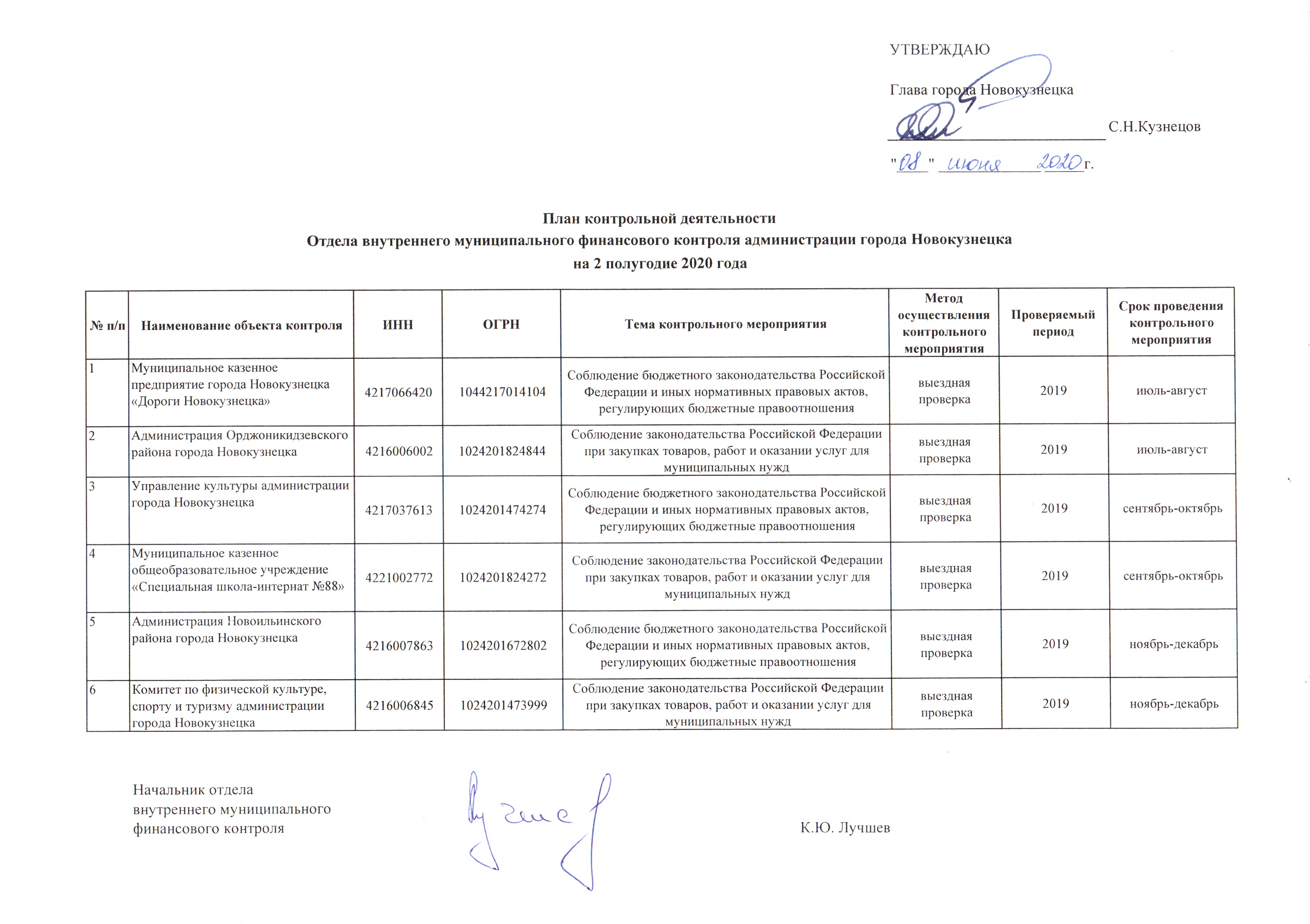 План контрольной деятельности на 2 полугодие 2020 года (с изменениями)