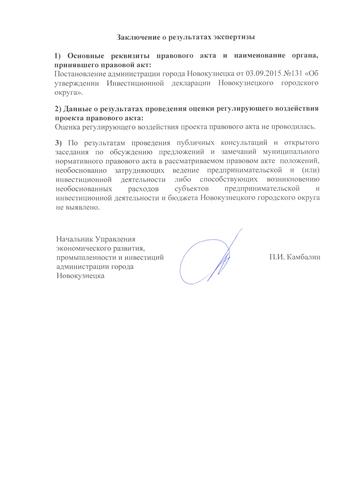Наименование нормативного правового акта: Постановление администрации города Новокузнецка от 03.09.2015 №131 «Об утверждении Инвестиционной декларации Новокузнецкого городского округа»